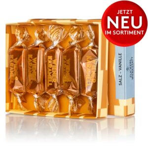 Zart schmelzende, handgemachte Karamellbonbons wie früher. Ein Karamell-Traum, der auf der Zunge zergeht.